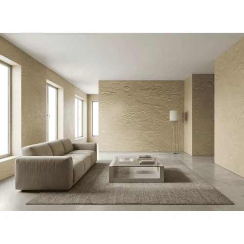 Наносим фактурную штукатурку Provence. Материал наносится кельмой в 1-2 слоя, в зависимости от желаемой толщины и рельефа фактуры. Первый слой наносится однородно, заполняя поверхность. Второй слой при необходимости наносят участками, наращивая рельеф до необходимого. После полного высыхания наносят лессирующий слой декоративной краски Sabbia di luna. |