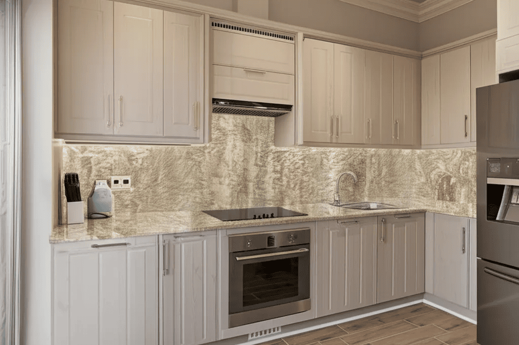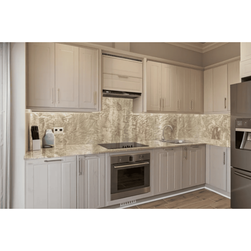 Наносим фактурную штукатурку Travertino. Первый слой наносится кельмой, однородно, заполняя поверхность и создавая необходимый рисунок. Второй слой наносят вторым цветом участками материал Pelle, позволяя материалу лишь немного подчеркнуть цвета. Допускается патинирование третьим слоем другим цветом материалом Perline. |