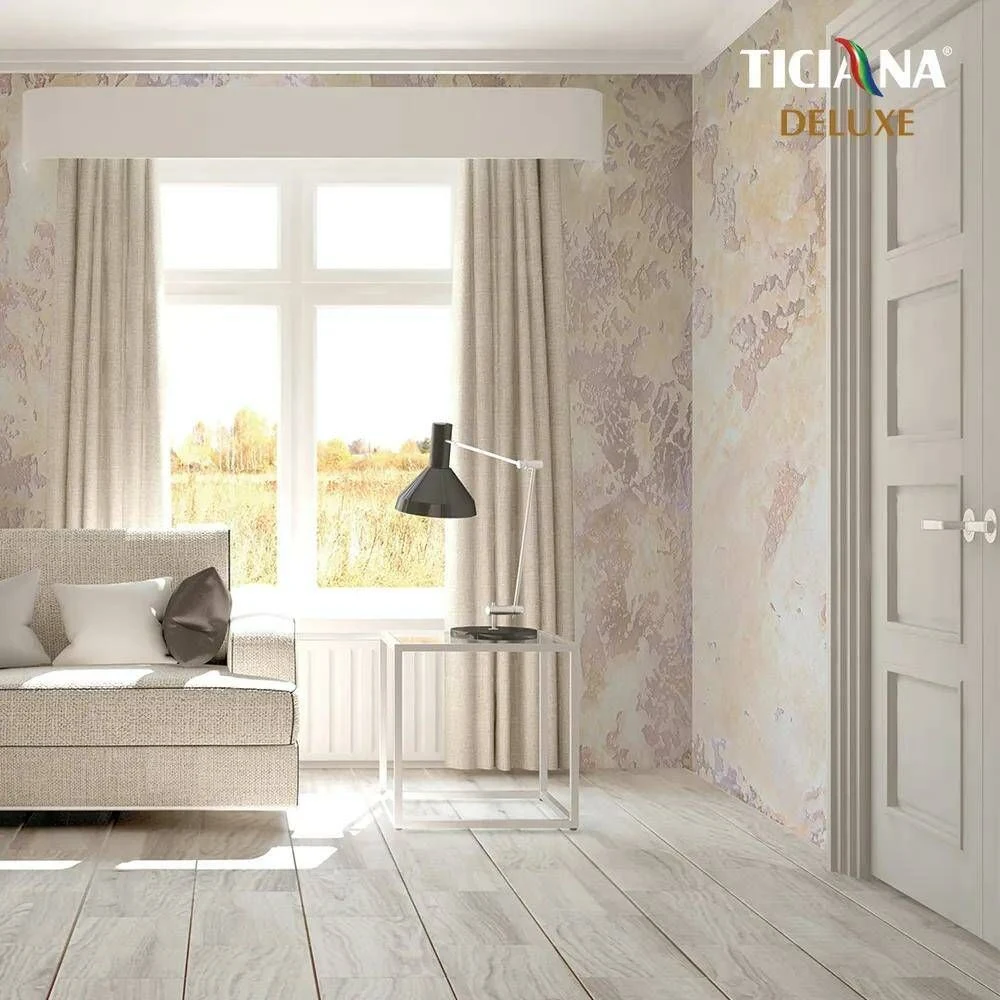 - в интерьерах, при обустройстве гостиных, спален, детских комнат, столовых и кабинетов. Водостойкость позволяет применять Ticiana Deluxe Alexandria во влажных помещениях — кухнях и ванных комнатах. Разнообразие фактур обеспечивает широкий спектр использования штукатурки при отделке любых интерьерных решений, от утонченной классики до современного минимализма;
