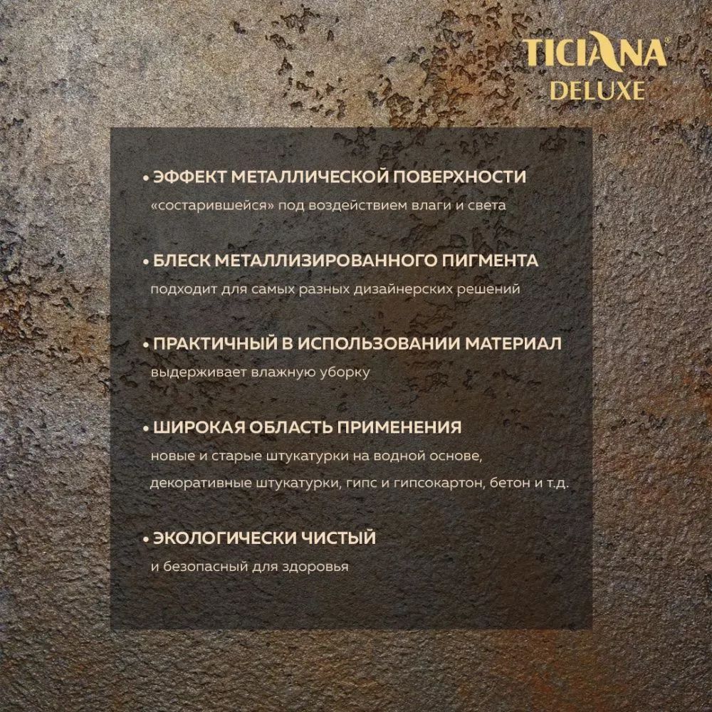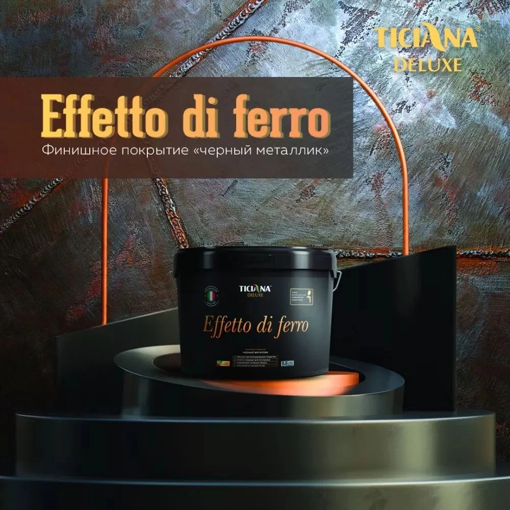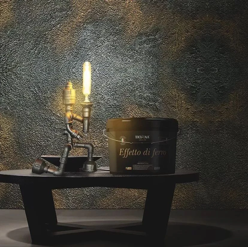 Инновационный продукт Ticiana Deluxe Effetto di Ferro образует на финишном покрытии декоративную пленку с характерным металлическим блеском. Это позволяет использовать материал при отделке современных интерьеров, создавая неповторимый декор на стенах.