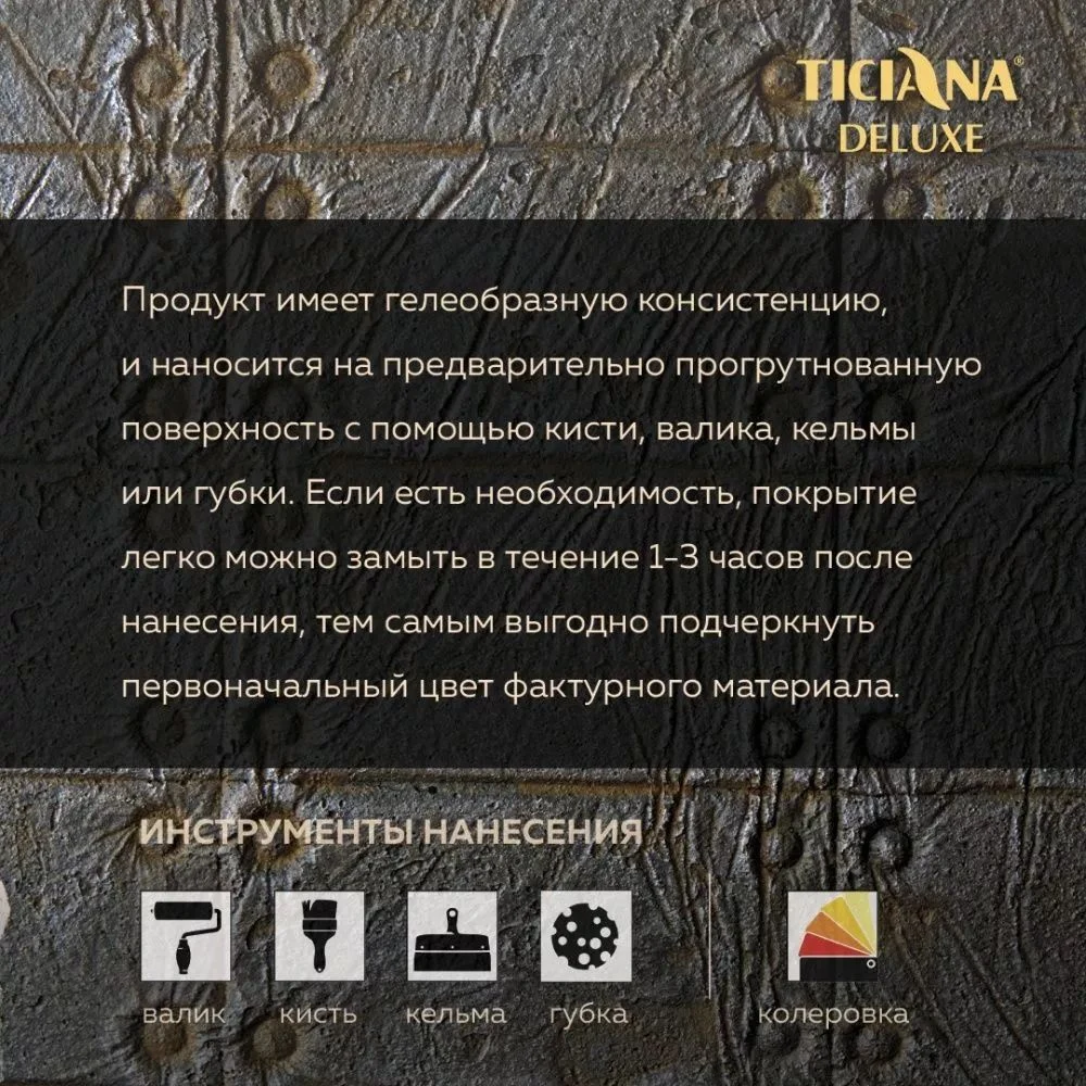 Материал Effetto di Ferro известного отечественного производителя Ticiana Deluxe представляет собой гелеобразный состав на водной основе, который реализуется готовым к применению. У продукта выраженный насыщенный цвет «черный металлик». После высыхания на поверхности образуется прочное покрытие с характерной текстурой и блеском, напоминающим состаренные металлические детали, подвергавшиеся воздействию влаги и солнца.