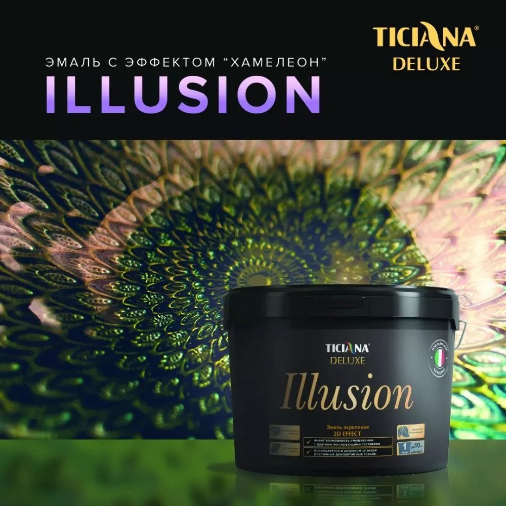Декоративное покрытие Illusion от отечественного производителя Ticiana Deluxe представляет собой акриловую эмаль с уникальным эффектом «хамелеон». После нанесения создается динамичная поверхность, цвет и восприятие которой меняются в зависимости от угла зрения и освещения. В основе материала — акрилаты и микроскопические перламутровые частицы, которые и обеспечивают завораживающее впечатление. В отличие от стандартных обоев и лакокрасочных покрытий, Ticiana Deluxe Illusion предлагает роскошную глубину и игру света, создавая на стенах завораживающую оптическую иллюзию.