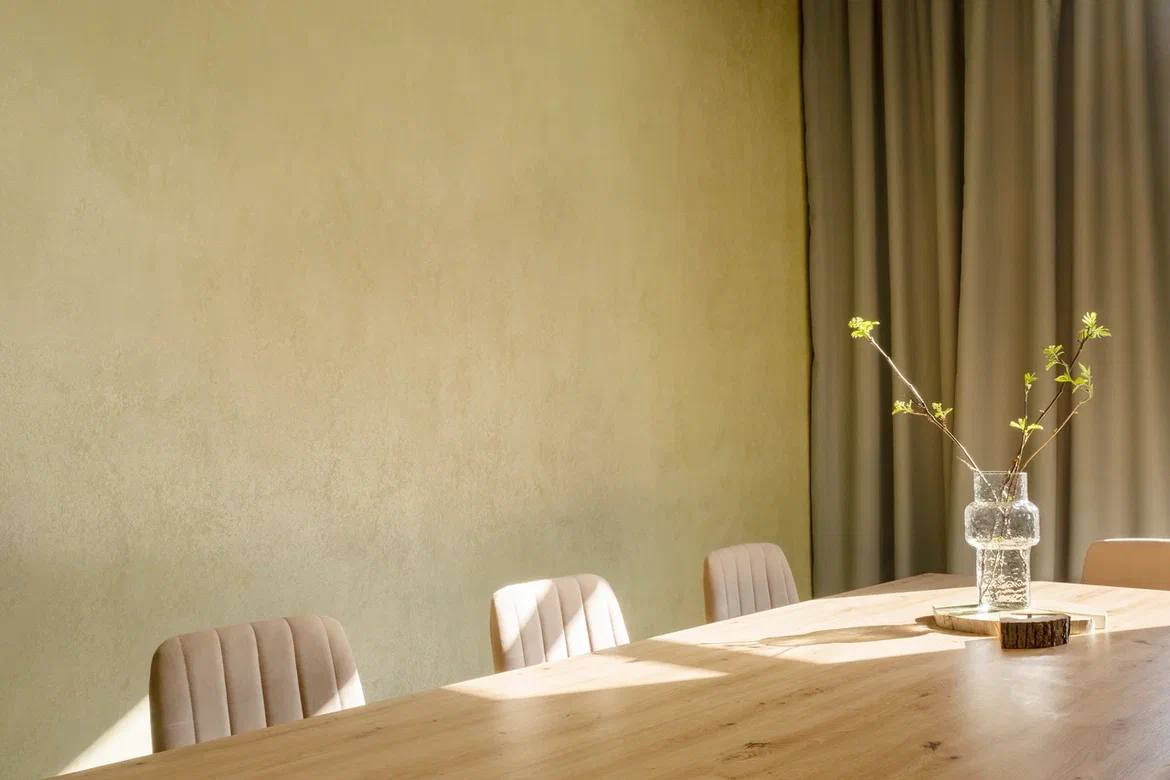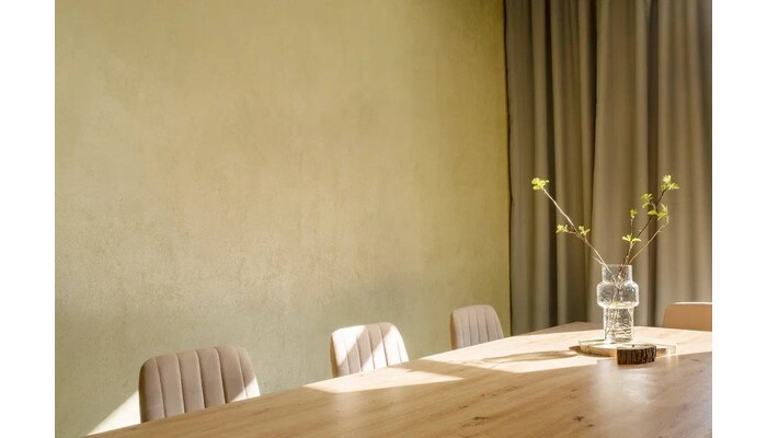 Одно из главных преимуществ декоративной краски — простое нанесение, не требующее особых навыков и знаний. Для нанесения можно использовать шпатель или кельму — при помощи этих инструментов удастся создать уникальные текстуры на окрашиваемых поверхностях.