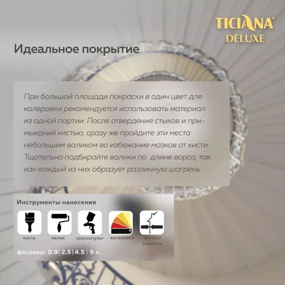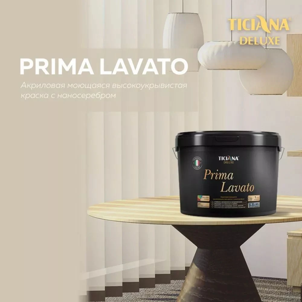 Акриловая моющаяся высокоукрывистая краска Ticiana Deluxe Prima Lavato представляет собой премиальное финишное покрытие, предназначенное для создания благородных матовых поверхностей. После полного высыхания на поверхности образуется прочная и гладкая дышащая пленка, устойчивая к влажной уборке.