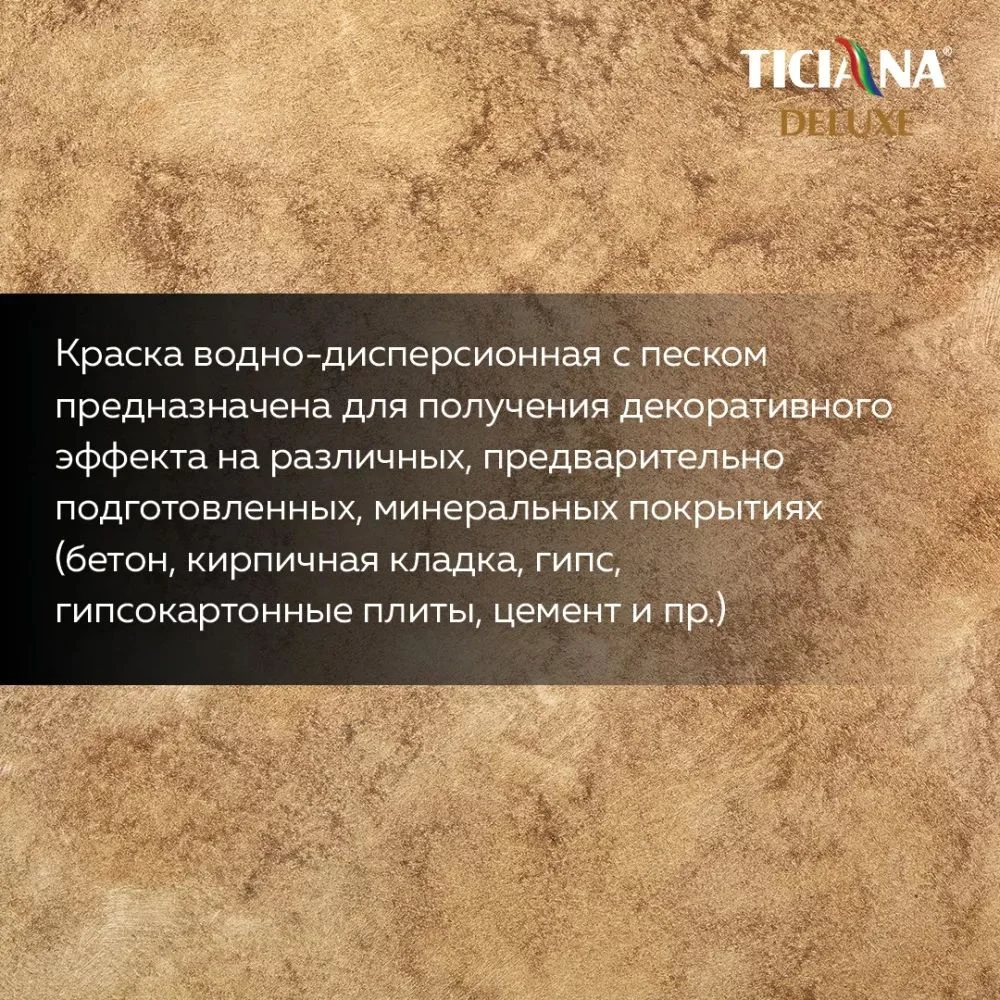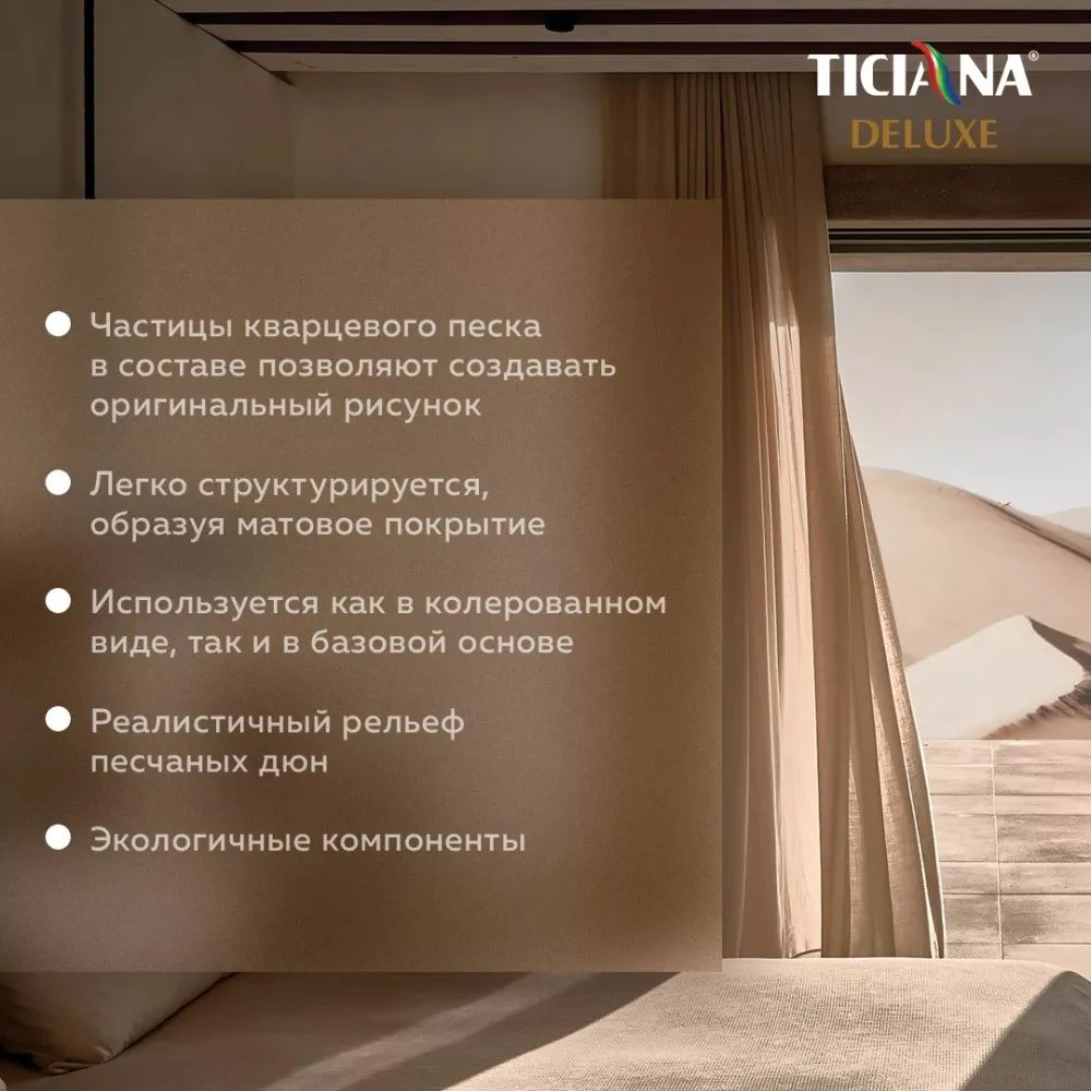 Ticiana Deluxe Sabbio Matt представляет собой декоративное покрытие с эффектом рустикальной, чуть шероховатой фактуры, напоминающей песчаные дюны. Главная особенность — сложная визуальная текстура, которая достигается за счет специальных минеральных наполнителей. На поверхности образуется прочный матовый финиш с изысканным бархатистым свечением, придающий стенам глубину и индивидуальность.