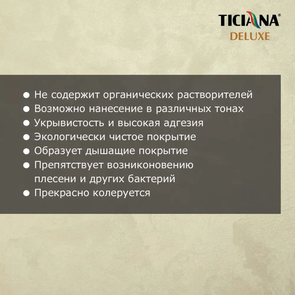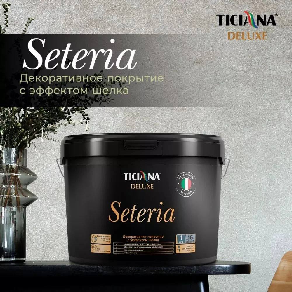 Материал представляет собой премиальное декоративное покрытие с эффектом благородного шелка, которое переносит роскошь королевских покоев в современный интерьер. Ticiana Deluxe Seteria создана на основе безвредных и безопасных акриловых смол, разводится водой, не имеет резкого запаха, не выделяет токсичных веществ, опасных для здоровья человека и окружающей среды.
