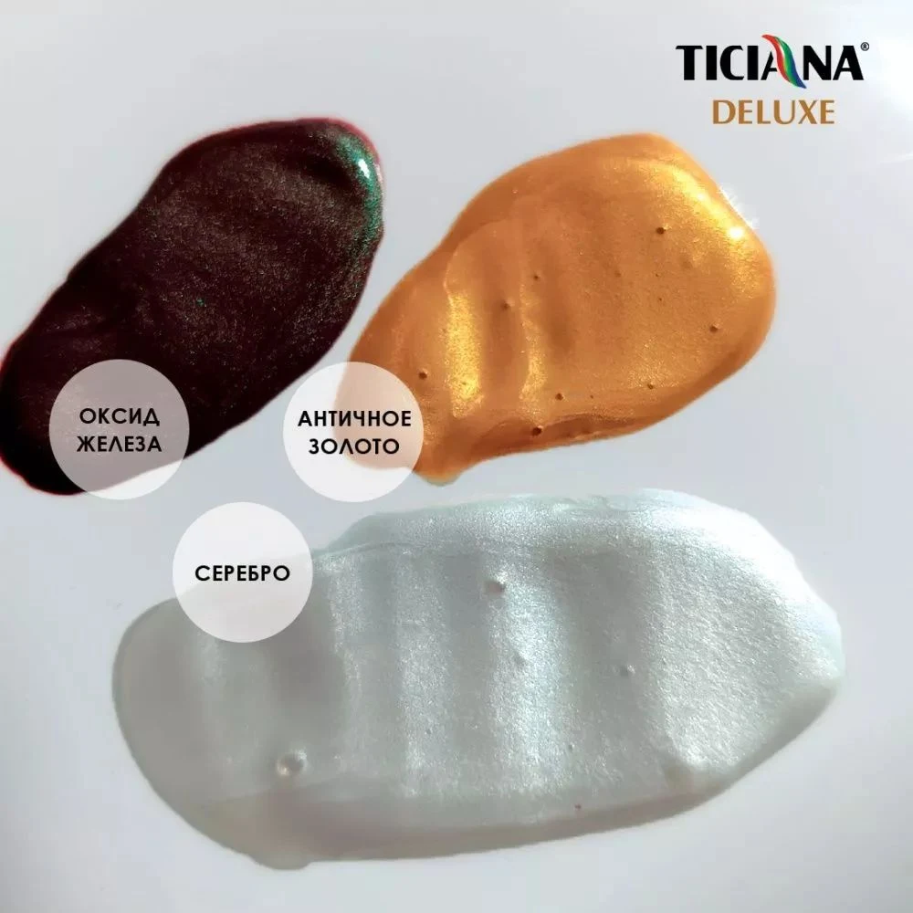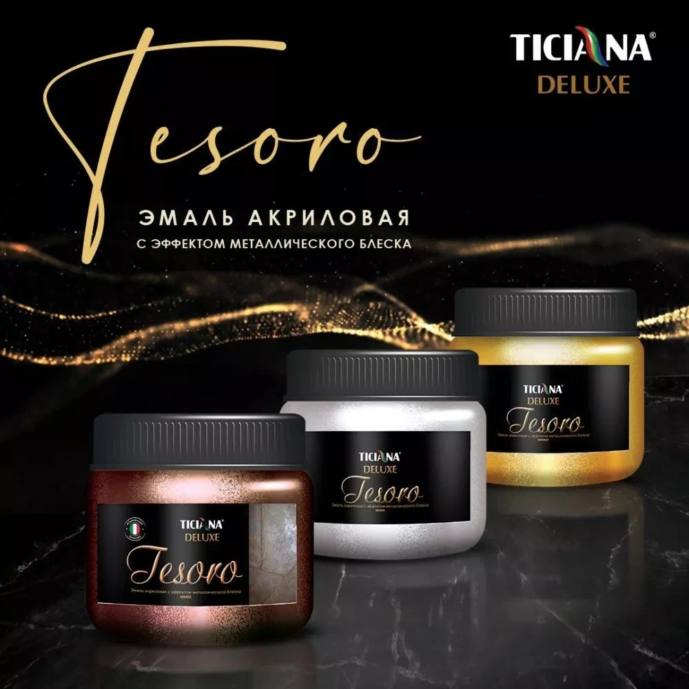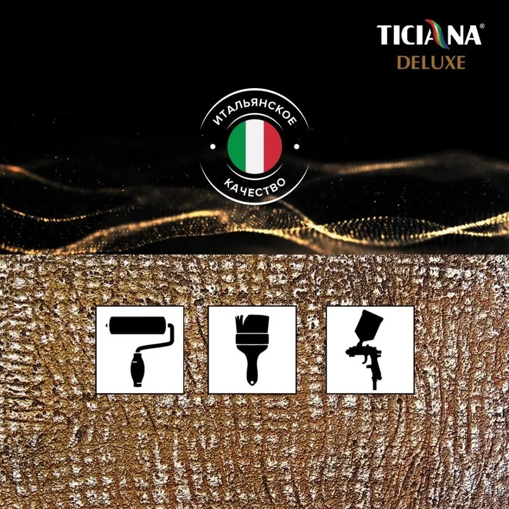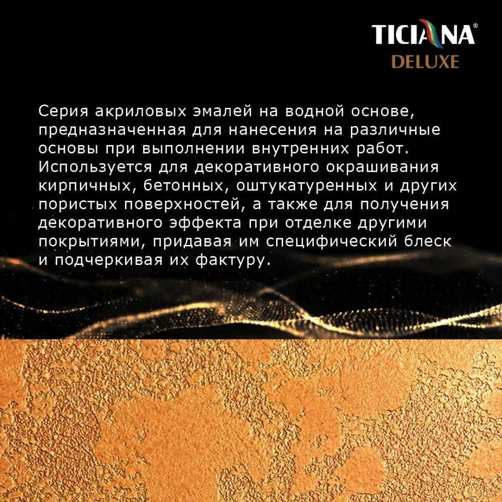 Ticiana Deluxe Tesoro представляет собой финишный материал премиум-класса, предназначенный для создания износостойкого декоративного покрытия со специфическим блеском. Главная задача акриловой эмали — придать благородную фактуру стенам, потолкам, другим поверхностям, подчеркнуть глубину цвета.